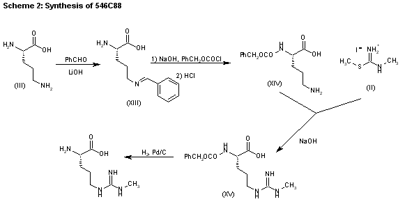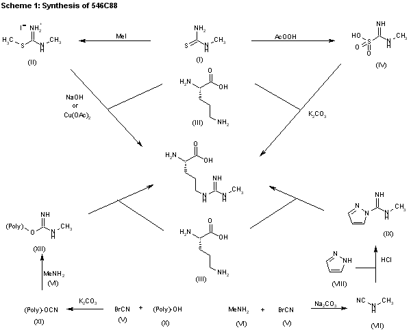546C88 has been obtained by several related ways: 1) The reaction of N-methylthiourea (I) with methyl iodide gives N,S-dimethylisothiouronium iodide (II), which is then condensed with L-ornithine (III) by means of NaOH or copper acetate. 2) The oxidation of N-methylthiourea (I) with peracetic acid in acetic acid gives N-methylamidinosulfonic acid (IV), which is then condensed with L-ornithine (III) by means of K2CO3 in water. 3) The reaction of cyanogen bromide (V) with methylamine (VI) by means of Na2CO3 in THF gives N-methylcyanamide (VII), which is condensed with pyrazole (VIII) by means of HCl in refluxing dioxane to yield N1-methylpyrazole-1-carboxamidine (IX). Finally, this compound is condensed with L-ornithine (III) by means of LiOH in water. 4) The reaction of cellulose (X) with cyanogen bromide (V) by means of K2CO3 in water/DMF gives the corresponding polymeric cyanate ester (XI), which is condensed with methylamine (VI) to yield the polymeric N-methylamidino compound (XII). Finally, this compound is condensed with L-ornithine (III) by means of CuCO3 in water.