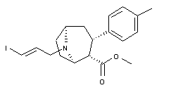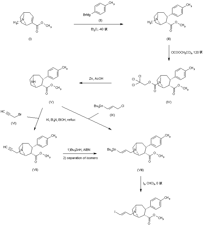 Conjugate addition of tolylmagnesium bromide (II) to ecgonidine methyl ester (I) provided the 3-beta-tolyl tropane derivative (III). N-Dealkylation of (III) to produce the nortropane analogue (V) was carried out via acylation with trichloroethyl chloroformate, followed by reductive cleavage of the resultant trichloroethyl carbamate (IV) with Zn and HOAc. Alkylation of the secondary amine (V) with propargyl bromide (VI) afforded the corresponding propargyl amine (VII). Subsequent hydrostannylation of the propargyl group furnished the desired (E)-stannylpropenyl compound (VIII) along with the corresponding (Z)-isomer. In an improved procedure, amine (V) was alkylated with (E)-3-chloro-1-(tributylstannyl)-1-propene (IX) to yield pure (VIII). Finally, the title vinyl iodide was obtained by iododestannylation of (VIII) employing iodine in cold CHCl3.