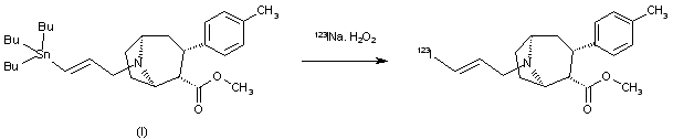 The reaction of the tributystannyl derivative (I) with 123INa and H2O2 in ethanol yields the target radiolabelled compound.