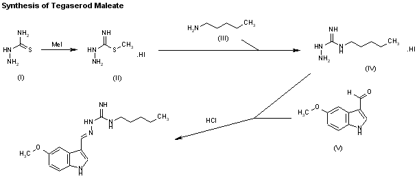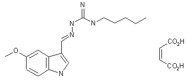 The alkylation of thiosemicarbazide (I) with methyl iodide in hot ethanol gives the corresponding S-methyl derivative (II), which is treated with pentylamine (III) in refluxing methanol to yield N1-amino-N3-pentylguanidine hydroiodide (IV). Finally, this compound is condensed with 5-methoxy-1H-indole-3-carbaldehyde (V) by means of HCl in methanol.