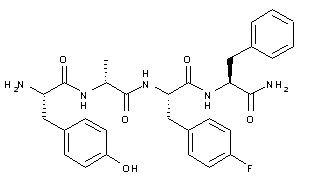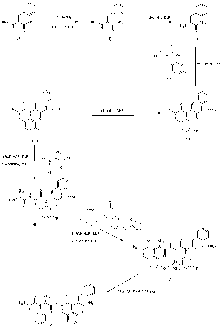 The title compound has been prepared by solid-phase peptide synthesis on a Knorr resin. N-Fmoc-L-Phenylalanine (I) is attached to the resin by means of BOP and HOBt, producing resin (II). Deprotection of the N-Fmoc group of (II) with piperidine in DMF gives the phenylalanine-bound resin (III). Subsequent coupling with N-Fmoc-L-p-fluorophenylalanine (IV) yields the dipeptide resin (V), which is further deprotected to (VI) with piperidine in DMF. Further coupling-deprotection cycles with N-Fmoc-D-alanine (VII) and N-Fmoc-O-tert-butyl-L-tyrosine (IX) provide the peptide resins (VIII) and (X) respectively. Finally, simultaneous cleavage from the resin and side chain deprotection is accomplished by treatment with trifluoroacetic acid.