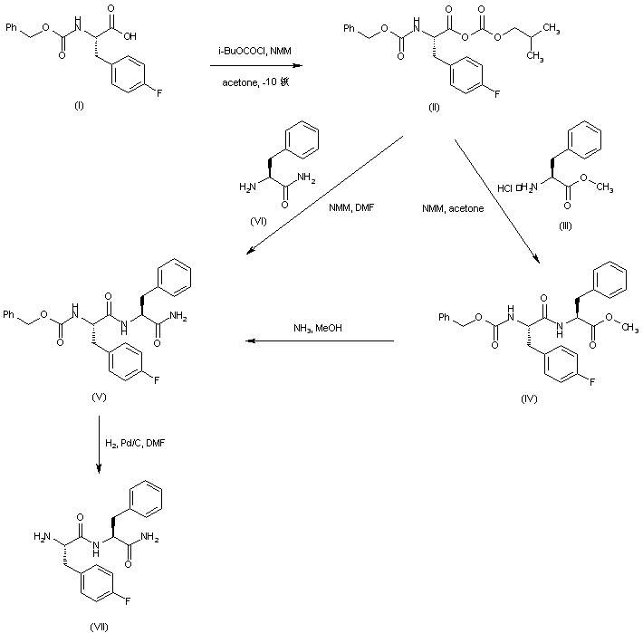 In a different strategy, N-Cbz-p-fluorophenylalanine (I) is activated as the mixed anhydride (II) employing isobutyl chloroformate and N-methylmorpholine. Coupling of anhydride (II) with phenylalanine methyl ester (III) leads to the dipeptide ester (IV), which is further treated with methanolic ammonia to produce amide (V). The dipeptide amide (V) is alternatively obtained by direct coupling of mixed anhydride (II) with phenylalanine amide (VI). Hydrogenolysis of the N-Cbz group of (V) in the presence of Pd/C furnishes the deprotected dipeptide (VII).