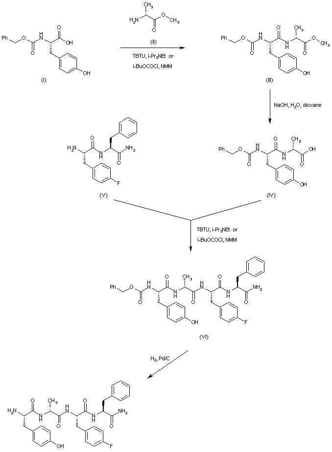 In an alternative procedure, N-Cbz-L-tyrosine (I) is condensed with D-alanine methyl ester (II), either employing TBTU as the coupling reagent or via previous activation as the mixed anhydride with isobutyl chloroformate, to produce dipeptide (III). After alkaline hydrolysis of the methyl ester function of (III), the resultant carboxylic acid (IV) is coupled to dipeptide amide (V) yielding the protected tetrapeptide (VI). Finally, deprotection of (VI) is carried out by catalytic hydrogenolysis over Pd/C.