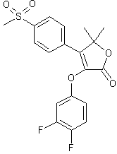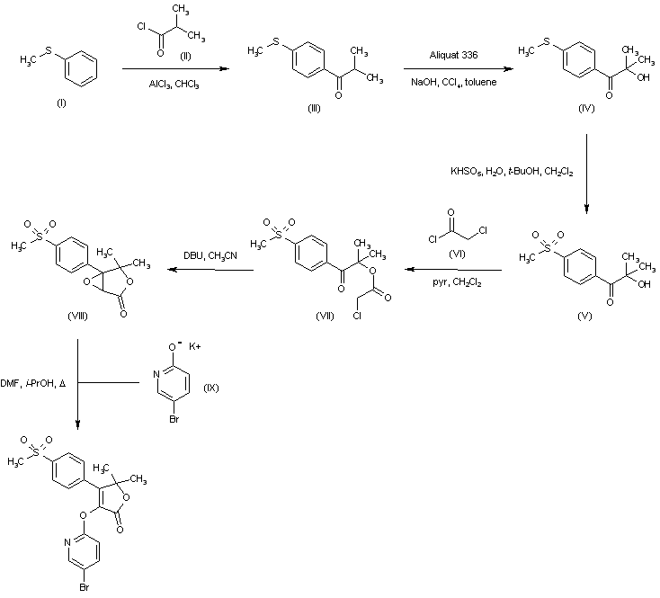 Friedel-Crafts acylation of thioanisole (I) with isobutyryl chloride (II) in the presence of AlCl3 gave ketone (III), which was hydroxylated with NaOH and a phase-transfer agent in CCl4-toluene to provide hydroxyketone (IV). Subsequent oxidation of the sulfide group employing Oxone(tm) gave rise to sulfone (V) (1). Further esterification of (V) with chloroacetyl chloride (VI) and pyridine yielded chloroacetate ester (VII), which was cyclized to the epoxy lactone (VIII) by treatment with DBU in acetonitrile. Finally, epoxide opening with the potassium salt of 5-bromo-2-hydroxypyridine (IX) produced the title (pyridyloxy)furanone.