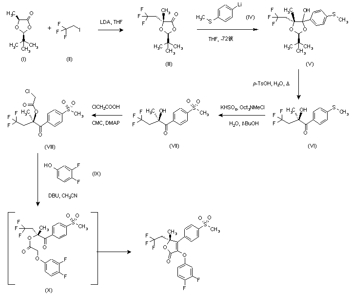 Alkylation of 2-(S)-tert-butyl-5-(S)-methyl-1,3-dioxolan-4-one (I) with 1,1,1-trifluoro-2-iodoethane (II) in the presence of LDA in THF at -72 C provided trifluoroethyl compound (III). Condensation of (III) with 4-(methylthio)phenyllithium (IV), prepared from 4-bromothioanisole and BuLi, gave (V), which was hydrolyzed with p-toluenesulfonic acid in boiling water to afford ketone (VI). Subsequent oxidation of sulfide group with KHSO5 (Oxone(R)) in the presence of Oct3NMeCl (Aliquat 336(R)) produced sulfone (VII). Esterification of (VII) with chloroacetic acid using 1-cyclohexyl-3-(2-morpholinoethyl)carbodiimide methyl-p-toluenesulfonate (CMC) as the condensing agent provided chloroacetate (VIII). Finally, condensation with 3,4-difluorophenol (IX) in the presence of DBU in acetonitrile gave the intermediate ether (X), which cyclized to produce the target furanone.