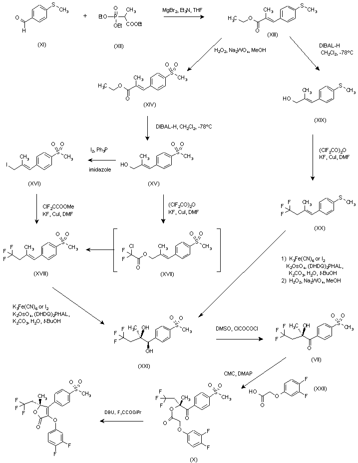 Horner-Emmons reaction of 4-(methylthio)benzaldehyde (XI) with phosphonate (XII) in the presence of Et3N and MgBr2 afforded unsaturated ester (XIII). Oxidation to sulfone (XIV) was effected with H2O2 and a catalytic amount of Na2WO4. Subsequent reduction of the ester group with DIBAL-H in CH2Cl2 at -78 C produced allyl alcohol (XV), which was converted to iodide (XVI) on treatment with I2, Ph3P and imidazole in acetonitrile. Reaction of this iodide with methyl chlorodifluoro-acetate in the presence of KF and CuI in DMF at 90 C yielded trifluoromethyl compound (XVIII). Alternatively, alcohol (XV) could be converted to (XVIII) with chlorodifluoroacetic anhydride followed by conversion of the intermediate ester (XVII) to trifluoroethyl compound in the presence of KF and CuI. Sharpless asymmetric dihydroxylation of olefin (XVIII) with potassium ferricyanide or iodine and a catalytic amount of K3OsO4 as the oxidants and the chiral ligand hydroquinidine 1,4-phthalazinediyl diether ((DHQD)2PHAL) yielded diol (XXI) with a 79% e.e. In a related procedure, diol (XXI) was obtained by reduction of ester (XIII) and treatment of the resulting allyl alcohol (XIX) with chlordifluoroacetic anhydride to give olefin (XX). Sharpless oxidation of (XX) then produced a mixture of diols with a sulfide, sulfoxide and sulfone groups, which was oxidized with H2O2 and Na2WO4 to the sulfone (XXI) with a 82% e.e. Recrystallization from isopropyl acetate-hexane raised the e.e. to > 98%. Then, Swern oxidation of diol (XXI) provided hydroxyketone (VII). Subsequent esterification with 3,4-difluorophenoxyacetic acid (XXII) in the presence of CMC and DMAP gave ester (X), which was cyclized to the target furanone by treatment with DBU using isopropyl trifluoroacetate as a water scavenger.
