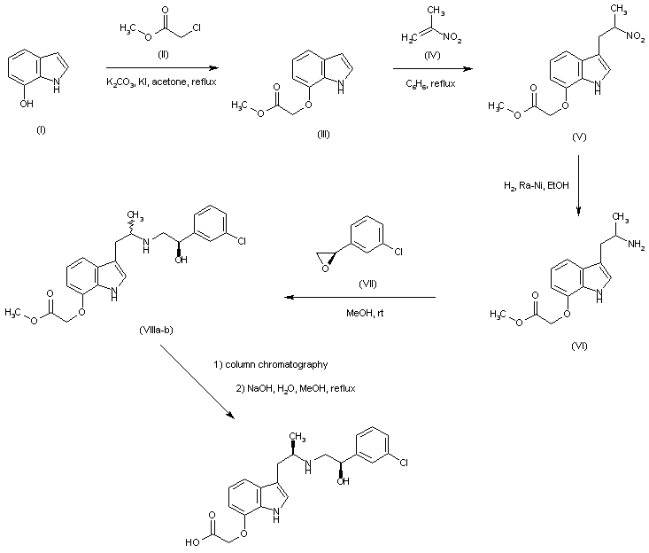 Alkylation of 7-hydroxyindole (I) with methyl chloroacetate (II) provided indolyl ether (III). Conjugate addition of 2-nitropropene (IV) to indole (III) in refluxing benzene, afforded the 3-(2-nitropropyl)indole (V), which was further reduced to the corresponding amine (VI) by catalytic hydrogenation over Raney nickel. Ring opening of the chiral epoxide (VII) with the racemic amine (VI) gave rise to a diastereomeric mixture of amino alcohols (VIII). After isolation of the desired (R,R)-isomer by column chromatography, basic hydrolysis of the methyl ester function yielded the title carboxylic acid.
