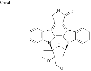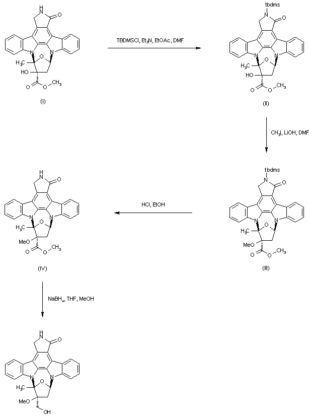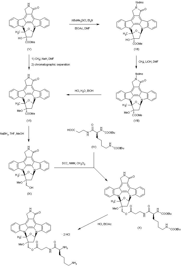 Preparation of intermediate (VI) has been reported by two related ways. The nonselective methylation of alkaloid K252a (V) with methyl iodide in the presence of NaH yielded the required O-methyl compound (VI) along with the N-methyl and the N,O-dimethyl derivatives, which were separated by silica gel chromatography. A large-scale process for the regioselective synthesis of ether (VI) was further developed. Selective protection of the amide group of (V) with tert-butyldimethylsilyl chloride gave the N-silyl derivative (VII), which was O-methylated with methyl iodide to afford methyl ether (VIII). Desilylation under acidic conditions then gave (VI). Subsequent reduction of the ester group of (VI) with with NaBH4 in THF/MOH provided alcohol (IX). This was coupled with dipeptide (IV) using DCC and NMM to afford ester (X). The Boc protecting groups were finally cleaved by treatment with HCl in EtOAc.