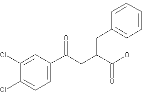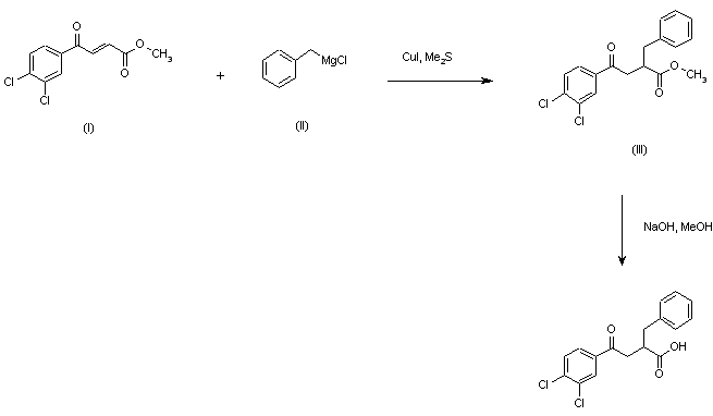 Conjugate addition of benzylmagnesium chloride (II) to unsaturated ketone (I) in the presence of cuprous iodide-dimethyl sulfide complex afforded the 2-benzyl derivative (III). Then, the ester function was saponified with NaOH in MeOH to give the title acid. Resolution of the enantiomers was effected by fractional crystallization of the ephedrine salts.