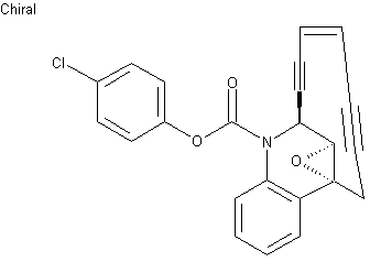 Treatment of quinoline (I) with ethynylmagnesium bromide (II) in THF at low temperature, and then with 4-chlorophenyl chloroformate (III) gave carbamate (IV). Subsequent deprotection of tert-butyldimethylsilyl group with p-toluenesulfonic acid yielded allyl alcohol (V), and this was stereoselectively epoxidized with m-chloroperbenzoic acid to give epoxyalcohol (VI). Coupling of (VI) with vinyl chloride (VII) in the presence of Pd(0)-CuI catalyst provided the enediyne compound (VIII). This was oxidized with Dess-Martin periodinane reagent to the aldehyde (IX). Finally, CsF-promoted cyclization in the presence of acetic anhydride provided the title compound as a 2:1 mixture of diastereoisomers, which could not be separated.