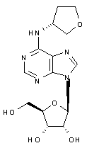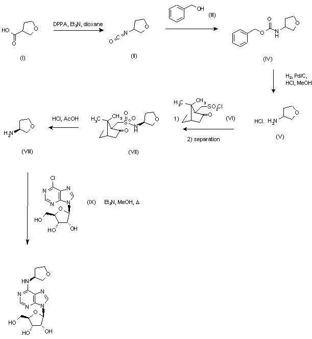 The reaction of 3-tetrahydrofuroic acid (I) with diphenyl phosphoryl azide (DPPA) in refluxing dioxane gave the intermediate isocyanate (II), which was treated with benzyl alcohol (III) to yield carbamate (IV). Subsequent hydrogenolysis in the presence of Pd/C afforded racemic amine (V), which was resolved by treatment with S-(+)-10-camphorsulfonyl chloride (VI) in pyridine, followed by column chromatography and recrystallization from acetone of the resulting sulfonamide (VII). Then, hydrolysis in HCl-AcOH provided the S-amine (VIII). Condensation of amine (VIII) with 6-chloropurine riboside (IX) in the presence of triethylamine in refluxing MeOH furnished the title compound.