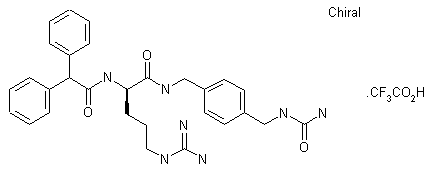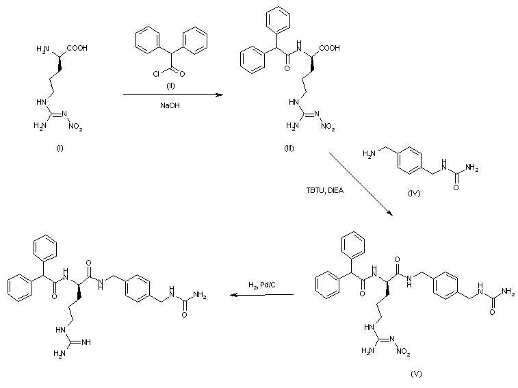 The reaction of Nomega'-nitro-D-arginine (I) with 2,2-diphenylacetyl chloride (II) by means of NaOH in THF/water gives the expected Nalpha-diphenylacetyl derivative (III), which is condensed with 4-(ureidomethyl)benzylamine (IV) by means of TBTU and DIEA in THF to yield the corresponding amide (V). Finally, this compound is hydrogenated with H2 over Pd/C in aqueous acetic acid in order to eliminate the Nomega'-nitro group and treated with trifluoroacetic acid to provide the target compound.