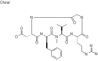 Cilengitide is synthesized using solid-phase Merrifield-type methods by sequentially adding N-Boc-N-Me-L-Val (I), N-Boc-D-Phe (III), N-Boc-4-O-t-Bu-L-Asp (V), N-Boc-Gly (VII) and Nalpha-Fmoc-Nomega-Mtr-L-Arg (IX) in a stepwise manner to a 4-hydroxymethylphenoxymethyl-polystyrene resin (Wang type resin), yielding peptide-resin intermediates (II), (IV), (VI), (VIII) and (X), respectively. Elimination of the resin from the peptide chain with a 1:1 mixture of TFA/dichloromethane results in the linear peptide (XI), which is then deprotected at the amino-terminal group by removing the Fmoc group with a 1:1 mixture of piperidine/DMF, to give peptide (XII).