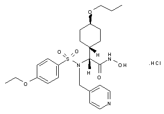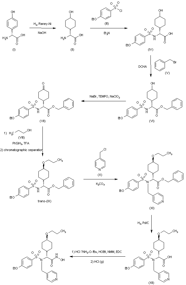 | 合成路线图解说明: Hydrogenation of D-4-hydroxyphenyl glycine (I) over Raney-Ni in NaOH affords 4-hydroxycyclohexylglycine (II), which is condensed with sulfonyl chloride (III) in dioxane in the presence of Et3N to yield derivative (IV). Carboxylic acid (IV) is converted into benzyl ester (VI) by treatment with benzyl bromide (V) by means of N,N'-dicyclohexylamine (DCHA) in DMF and (VI) is then oxidized by treatment with NaBr, 2,2,6,6-tetramethyl-1-piperidinyloxy free radical (TEMPO) and NaClO2 in CH2Cl2/H2O to provide ketone (VII). Condensation of (VII) with n-propanol (VIII) by means of PhSiH3 and TFA gives a mixture of compounds from which trans-(IX) is cromatographically separated. Then ketone (IX) reacts with 4-picolyl chloride (X) and K2CO3 in DMF to furnish compound (XI). Hydrogenation of benzyl acetate (XI) over Pd/C in EtOH/HCl affords acetic acid derivative (XII), which is coupled to O-t-butylhydroxylamine hydrochloride by means of HOBt, N-methylmorpholine and N-[dimethylaminopropyl]-N'-ethylcarbodiimide hydrochloride (EDC稨Cl) in CH2Cl2. Finally, removal of the t-Bu group with HCl (gas) in dichloroethane/EtOH yields the desired compound. |