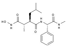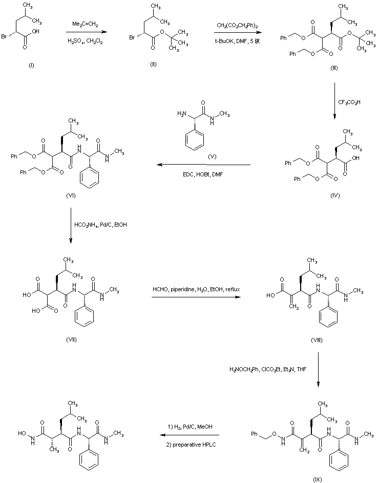Esterification of (S)-2-bromo-4-methylpentanoic acid (I) with isobutylene in the presence of H2SO4 affords the corresponding tert-butyl ester (II). Subsequent alkylation of dibenzyl malonate with bromoester (II) gives triester (III). After acidic tert-butyl group cleavage in (III), the resultant acid (IV) is coupled with L-phenylglycine-N-methylamide (V), yielding diamide (VI). Transfer hydrogenolysis of the dibenzyl ester (VI) with ammonium formate and Pd/C produces diacid (VII). Mannich reaction of malonic acid (VII) with formaldehyde and piperidine, with concomitant decarboxylation, leads to the alpha-methylene carboxylic acid (VIII), which is further coupled to O-benzyl hydroxylamine giving hydroxamate (IX). Simultaneous double bond hydrogenation and O-debenzylation of (IX) then produces a diastereomeric mixture of alpha-methyl hydroxamic acids, from which the desired diastereoisomer is isolated by preparative HPLC.