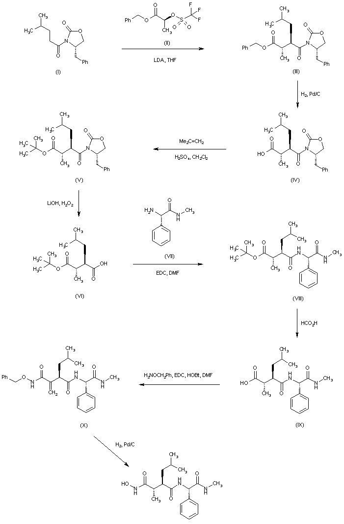 An alternative, stereoselective synthesis has been reported. The alkylation of the chiral N-acyl oxazolidinone (I) with benzyl L-2-[(trifluoromethylsulfonyl)oxy]propionate (II) leads to the succinic acid derivative (III). After hydrogenolysis of the benzyl ester group of (III), the resultant carboxylic acid (IV) is esterified with isobutylene and H2SO4 to afford the tert-butyl ester (V). Removal of the chiral auxiliary group of (V) is then effected by hydrolysis with lithium peroxide, yielding acid (VI). Subsequent coupling of (VI) with L-phenylglycine-N-methylamide (VII) provides diamide (VIII). Acidic tert-butyl ester cleavage in (VIII) gives acid (IX), which is condensed with O-benzyl hydroxylamine to furnish hydroxamate (X). The O-benzyl group of (X) is finally removed by catalytic hydrogenolysis over Pd/C.