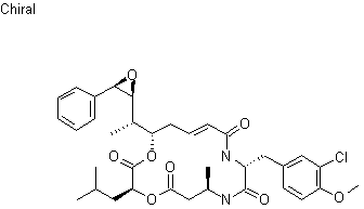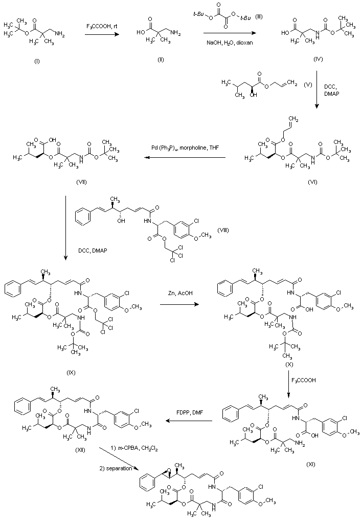 Title compound can be prepared either by bacterial fermentation or by chemical synthesis. Thus, the compund was isolated from cultures of Nostoc sp. GSV 224, growing in the presence of 2,2-dimethyl-b-alanine. After lyophilization and extraction with CH3CN-CH2Cl2, the extract was subjected to several chromatographic purifications to provide the pure compound. Alternatively, 2,2-dimethyl-b-alanine tert-butyl ester (I) was deprotected with trifluoroacetic acid, and the resulting carboxylic acid (II) was treated with di tert-butyl oxalate (III) in the presence of NaOH to afford carbamate (IV). Subsequent coupling with allyl (S)-2-hydroxy-4-methylpentanoate (V) using DCC and DMAP gave ester (VI). The allyl ester was then cleaved by treatment with Pd(Ph3P)4 and morpholine in THF at r.t., and the resulting acid (VII) was coupled with compound (VIII) in the presence of DCC and DMAP to afford (IX). After deprotection of the trichloroethyl ester group by treatment with Zn in AcOH and subsequent cleavage of the N-Boc group with trifluoroacetic acid, the resulting amino acid compound (XI) was cyclized using pentafluorophenyl diphenyl phosphinate (FDPP) to furnish (XII). Finally, epoxidation with meta-chloroperbenzoic acid provided a mixture of diastereomeric epoxides that were separated by reverse phase HPLC.