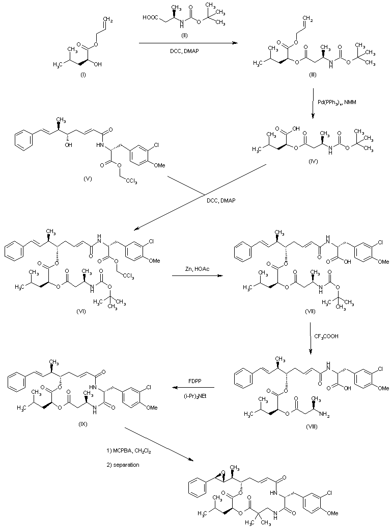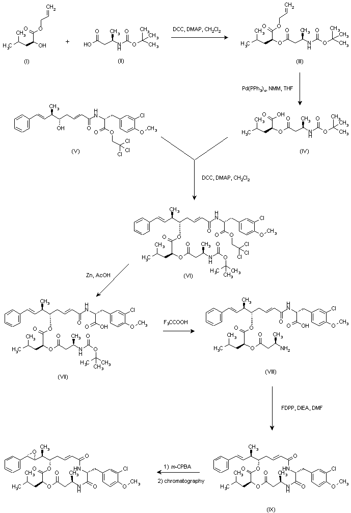 Condensation of (R)-3-(tert-butoxycarbonylamino)butyric acid (II) with hydroxyester (I) using DCC and DMAP provided compound (III). Removal of the allyl group of (III) was then effected by treatment with Pd(PPh3)4 and N-methylmorpholine (NMM) to afford acid (IV). Subsequent coupling of (IV) with alcohol (V) in the presence of DCC and DMAP yielded the corresponding ester (VI). After deprotection of the trichloroethyl ester with Zn in AcOH group (VII), and subsequent deprotection of the N-tert-butoxycarbonyl group with trifluoroacetic acid, the resulting amino acid compound (VIII) was cyclized by treatment with FDPP in the presence of diisopropylethylamine to provide lactam (IX). Finally, epoxidation of the styrene olefin with m-chloroperbenzoic acid in CH2Cl2 furnished a mixture of diastereoisomeric epoxides, from which the title compound was isolated by reverse-phase HPLC.