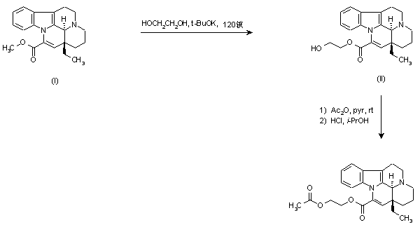 Transesterification of l,l-trans apovincaminic acid methyl ester (I) with ethylene glycol at 120 C in the presence of potassium tert-butoxide furnished the hydroxyethyl ester (II). Subsequent acetylation of (II) with Ac2O in pyridine gave the corresponding acetoxyethyl ester, which was isolated as the hydrochloride salt upon treatment with HCl in isopropanol.