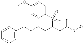 Horner-Emmons condensation of 5-phenylpentanal (I) with phosphonate (II) in the presence of NaH yielded tert-butyl 7-phenyl-2-heptenoate (III). Subsequent Michael addition of 4-methoxythiophenol (IV) to (III) using a catalytic amount of BuLi provided thioether (V). After acid deprotection of the tert-butyl ester of (V) with TFA, the resulting carboxylic acid (VI) was converted to acid chloride (VII) and then condensed with O-(trimethylsilyl)hydroxylamine to produce hydroxamic acid (VIII). Finally, sulfide oxidation of (VIII) with Oxone furnished the target beta-sulfonylhydroxamic acid. Alternatively tet-butyl ester (III) can be hydrolyzed first to the free acid (IX) with TFA, and then condensed with thiophenol (IV) by means of piperidine to afford the previously described carboxylic acid (VI).