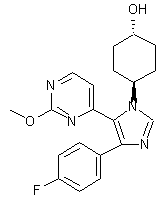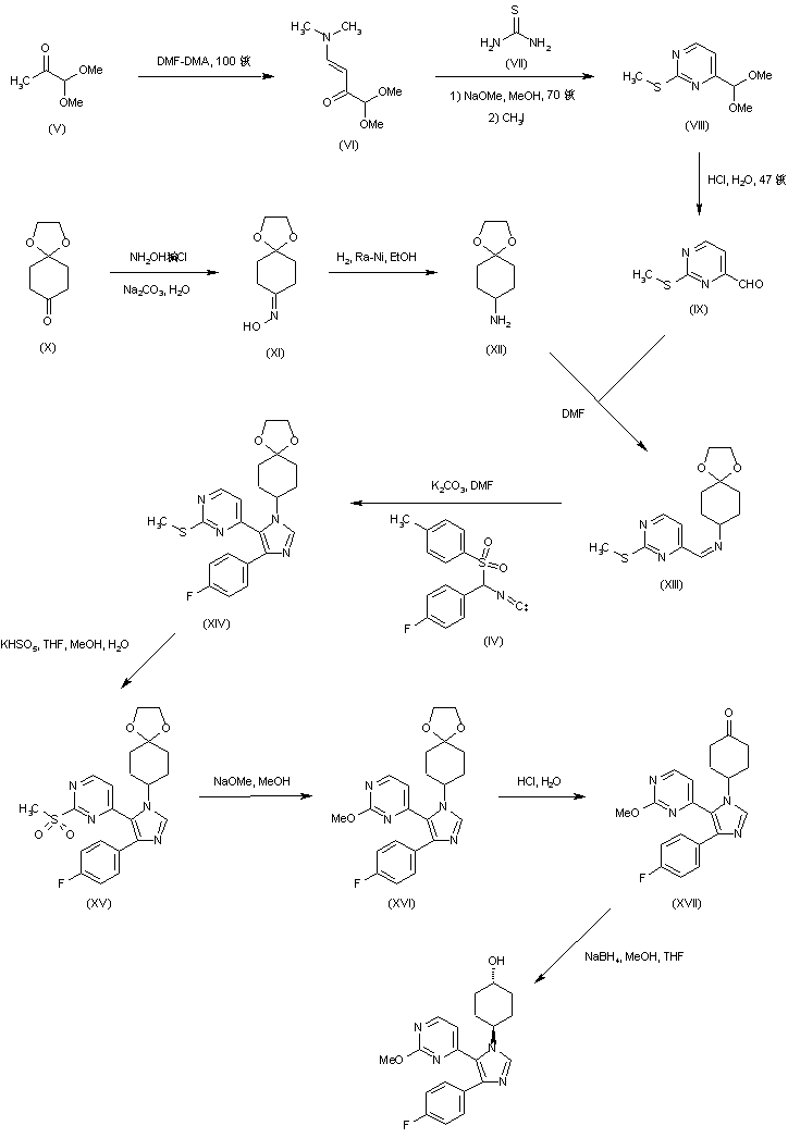 Condensation of pyruvic aldehyde dimethyl acetal (V) with dimethylformamide dimethyl acetal produced enamino ketone (VI). Cyclization of (VI) with thiourea (VII), followed by methylation with iodomethane furnished the (methylsulfanyl)pyrimidine (VIII). Acid hydrolysis of the dimethyl acetal gave rise to aldehyde (IX). Cyclohexanedione monoketal (X) was converted to oxime (XI) and then hydrogenated to give amine (XII). This was condensed with aldehyde (IX) yielding imine (XIII). Reaction of imine (XIII) with sulfonyl isocyanide (IV) gave rise to imidazole (XIV). The methylsulfanyl group of (XIV) was then oxidized to sulfone (XV) employing oxone? Further displacement of the methylsulfonyl group of (XV) with NaOMe produced the methoxy pyrimidine (XVI). After ketal (XVI) hydrolysis, reduction of the resulting ketone (XVII) with NaBH4 furnished the title alcohol.