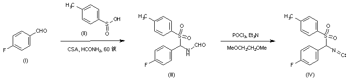 The condensation of p- fluorobenzaldehyde (I) with p-toluenesulfinic acid (II) in the presence of camphorsulfonic acid in formamide produced the tosylmethyl formamide (III). This was dehydrated to the required isocyanide (IV) using POCl3 and Et3N in cold dimethoxyethane.