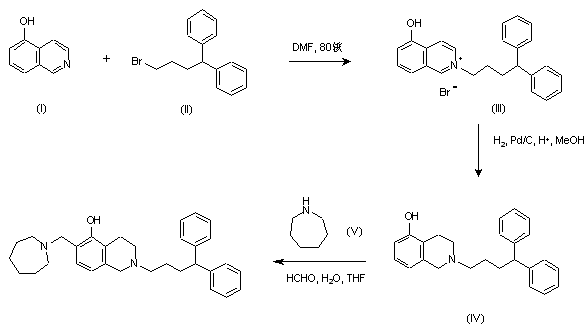 Alkylation of 5-hydroxyisoquinoline (I) with bromide (II) in DMF at 80 C afforded isoquinolinium salt (III). This was reduced to tetrahydroisoquinoline (IV) by catalytic hydrogenation in the presence of Pd/C. Finally, Mannich reaction with formaldehyde and perhydroazepine (V) in THF-water at r.t. provided the target compound.