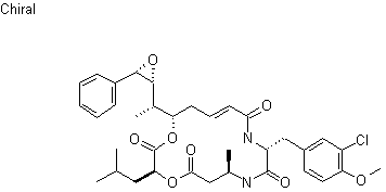 Title compound can be prepared either by bacterial fermentation or by chemical synthesis. Thus, the compund was isolated from cultures of Nostoc sp. GSV 224, growing in the presence of 2,2-dimethyl-b-alanine. After lyophilization and extraction with CH3CN-CH2Cl2, the extract was subjected to several chromatographic purifications to provide the pure compound. Alternatively, 2,2-dimethyl-b-alanine tert-butyl ester (I) was deprotected with trifluoroacetic acid, and the resulting carboxylic acid (II) was treated with di tert-butyl oxalate (III) in the presence of NaOH to afford carbamate (IV). Subsequent coupling with allyl (S)-2-hydroxy-4-methylpentanoate (V) using DCC and DMAP gave ester (VI). The allyl ester was then cleaved by treatment with Pd(Ph3P)4 and morpholine in THF at r.t., and the resulting acid (VII) was coupled with compound (VIII) in the presence of DCC and DMAP to afford (IX). After deprotection of the trichloroethyl ester group by treatment with Zn in AcOH and subsequent cleavage of the N-Boc group with trifluoroacetic acid, the resulting amino acid compound (XI) was cyclized using pentafluorophenyl diphenyl phosphinate (FDPP) to furnish (XII). Finally, epoxidation with meta-chloroperbenzoic acid provided a mixture of diastereomeric epoxides that were separated by reverse phase HPLC.