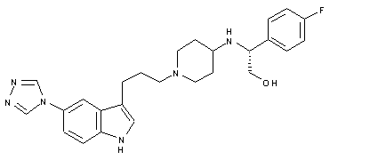 Hydrogenation of p-nitroacetanilide (I) over Pd/C afforded p-aminoacetanilide (II), which was converted to triazolylacetanilide (III) upon treatment with N,N-dimethylformamide azine and p-toluenesulfonic acid. Acid hydrolysis of the acetamide (III) provided triazolylaniline (IV). Subsequent diazotization of (IV), followed by SnCl2 reduction of the diazonium salt furnished hydrazine (V). Fischer indole synthesis employing (V) and dihydropyran (VI) gave rise to the indolylpropanol (VII), which was converted to the intermediate mesylate (VIII) using CH3SO2Cl and Et3N.
