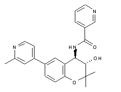 Electrophilic bromination of chromene (XII) with N-bromosuccinimide in moist DMSO produced the trans-bromohydrin (XIII). The racemic (XIII) was then resolved by esterification with (R)-alpha-methoxyphenylacetic acid (XIV), using DCC as the coupling reagent, and subsequent chromatographic separation of the diastereomeric mixture. Hydrolysis of the desired bromoester isomer (XV) under basic conditions gave rise to the chiral cis-epoxide (XVI). The target amino alcohol (XVII) was then obtained by regioselective ring opening of epoxide (XVI) with ethanolic ammonia in a pressure vessel. Finally, coupling of (XVII) with nicotinoyl chloride (XVIII) furnished the title amide.