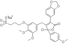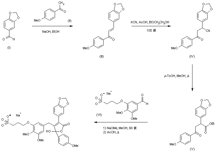 Aldol condensation of piperonal (I) with 4-methoxyacetophenone (II) afforded chalcone (III). Subsequent addition of KCN to (III) in the presence of AcOH gave nitrile (IV), which was hydrolyzed in methanol in the presence of p-TsOH to provide ketoester (V). Subsequent base-catalyzed condensation of (V) with aldehyde (VI), followed by cyclization in refluxing AcOH furnished the target butenolide.