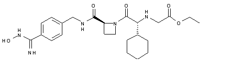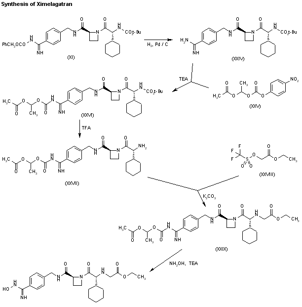 Removal of the benzyl-protecting group of compound (XI) by hydrogenation over Pd/C in EtOH/H2O provides the benzamidine derivative (XXIV), which by reaction with 1-(acetoxyethyl)-4-nitrophenylcarbonate (XXV) by means of TEA in dichloromethane provides the N-protected benzamidine derivative (XXVI). Treatment of (XXVI) with trifluoroacetic acid in the same solvent allows elimination of the Boc group to yield compound (XXVII), which by condensation with 2-(trifluoromethanesulfonyloxy)acetic acid ethyl ester (XXVIII) in the presence of K2CO3 in the same solvent affords the ximelagatran precursor (XXIX). Finally, compound (XXIX) is treated with hydroxylamine and TEA in ethanol in order to deprotect and to oxidize the amidino group, yielding ximelagatran.