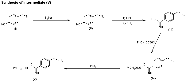The reaction of 4-cyanobenzyl bromide (I) with NaN3 in DMF gives 4-cyanobenzyl azide (II), which is treated first with HCl and then with ammonia to yield 4-(azidomethyl)benzamidine (III). Protection of the amidino group of (III) with benzyl chloroformate affords the protected compound (IV), which is finally reduced at the azido group with PPh3 in THF to provide 4-(benzyloxycarbonylamidino)benzylamine (V).