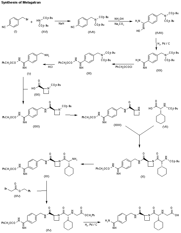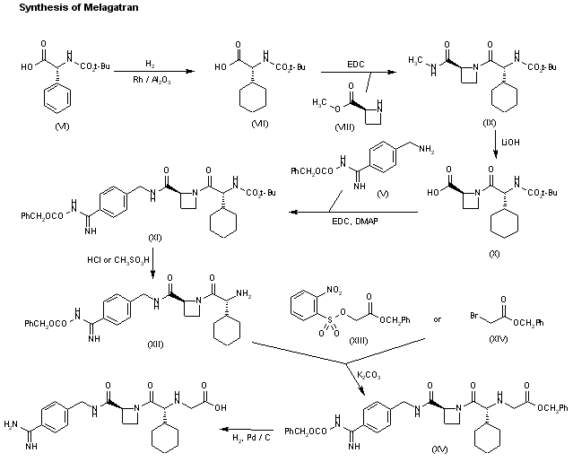 Reduction of the phenyl ring of N-(tert-butoxycarbonyl)-(R)-phenylglycine (VI) with H2 over Rh/Al2O3 in methanol gives the protected (R)-cyclohexylglycine (VII), which is condensed with azetidine (VIII) by means of EDC in acetonitrile to yield the dipeptide (IX). Hydrolysis of the ester group of (IX) affords the carboxylic acid (X), which is condensed with the amino group of the previous intermediate (V) by means of EDC and DMAP in acetonitrile or ethyl acetate/acetonitrile to provide adduct (XI). Cleavage of the Boc-protecting group of (XI) with HCl or methanesulfonic acid gives (XII) with a terminal amino group that is condensed with benzyl 2-(2-nitrophenylsulfonyloxy)acetate (XIII) or benzyl 2-bromoacetate (XIV) by means of K2CO3 in the same solvent to yield the melagatran precursor (XV). Finally, this compound is deprotected by hydrogenation with H2 over Pd/C in methanol.