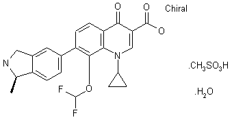The methylation of 2,6-difluorophenol (I) with methyl iodide and K2CO3 in DMF gives 2,6-difluoroanisole (II), which by treatment with butyllithium and CO2 yields 2,4-difluoro-3-methoxybenzoic acid (III). The methylation of (III) with diazomethane in ether affords the methyl ester (IV), which by reaction with BBr3 in dichloromethane results in 2,4-difluoro-3-hydroxybenzoic acid methyl ester (V). The alkylation of (V) with chlorodifluoromethane and K2CO3 in DMF gives 3-(difluoromethoxy)-2,4-difluorobenzoic acid methyl ester (VI), which is treated with sodium azide in DMSO, yielding the azido derivative (VII). The reduction of (VII) with H2 over Pd/C in ethanol affords 3-amino-2,4-difluorobenzoic acid methyl ester (VIII), which is hydrolyzed with NaOH in ethanol, giving the free acid (IX). The reaction of (IX) with NaNO2 and HBr yields 4-bromo-3-(difluoromethoxy)-2-fluorobenzoic acid (X), which is condensed with the magnesium salt of malonic acid monoethyl ester (XI) by means of CDI in THF, affording the 3-oxopropionate (XII). The reaction of (XII) with dimethylformamide dimethylacetal (XIII) and cyclopropylamine (XIV) by means of acetic anhydride in dichloromethane gives the 3-(cyclopropylamino)acrylate (XV), which is cyclized by means of K2CO3 in hot DMSO, yielding quinolone (XVI). The condensation of (XVI) with the isoindolylboronic acid derivative (XVII) - obtained by reaction of 5-bromo-1(R)-methyl-2-tritylisoindoline (XIX) with triisopropyl borate and butyllithium in THF - by means of bis(triphenylphosphine)palladium(II) chloride as catalyst in refluxing toluene affords the protected compound (XVIII), which is finally deprotected with HCl in ethanol.