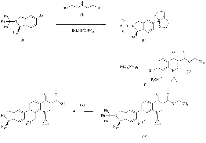 The reaction of 5-bromo-1(R)-methyl-2-(triphenylmethyl)-2,3-dihydro-1H-isoindole (I) with; BuLi, triisopropyl borate and diethanolamine (II) gives the boronic ester (III), which is condensed with 1-cyclopropyl-7-bromo-8-(difluoromethoxy)-4-oxo-1,4-dihydroquinoline-3-carboxylic acid ethyl ester (IV) by means of PdCl2(PPh3)2 to yield the precursor (V). Finally, this compound is deprotected by a treatment with HCl in ethanol/water to provide the target Garenoxacin.