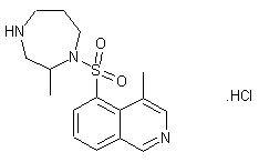 Nitration of 4-methylisoquinoline (I) with KNO3 in H2SO4 provided the 5-nitro derivative (II). Subsequent catalytic hydrogenation of the nitro group of (II) gave amine (III). Diazotization of (III), followed by treatment with SO2 and CuCl2, generated the sulfonyl chloride (IV). This was condensed with 4-Boc-2-methyl-perhydro-1,4-diazepine (V) to furnish the sulfonamide (VI). The Boc protecting group of (VI) was finally cleaved using HCl in aqueous EtOH.
