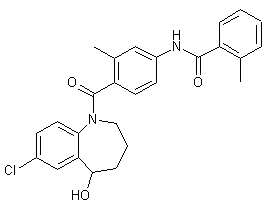 5-Chloro-2-nitrobenzoic acid (I) was converted into methyl ester (II) using dimethyl sulfate and K2CO3 in acetone. The nitro group of (II) was then reduced with SnCl2 to afford aniline (III), which was protected as the p-toluenesulfonamide (IV) with tosyl chloride in pyridine. Alkylation of (IV) with ethyl 4-bromobutyrate (V) yielded diester (VI). Subsequent Dieckmann cyclization of (VI) in the presence of potassium tert-butoxide provided benzazepinone (VIIa-b) as a mixture of ethyl and methyl esters, which was decarboxylated to (VIII) by heating with HCl in AcOH. Deprotection of the tosyl group of (VIII) was carried out in hot polyphosphoric acid. The resulting benzazepinone (IX) was condensed with 2-methyl-4-nitrobenzoyl chloride (X) to give amide (XI). After reduction of the nitro group of (XI) to the corresponding aniline (XII), condensation with 2-methylbenzoyl chloride (XIII) provided diamide (XIV). Finally, ketone reduction in (XIV) by means of NaBH4 led to the target compound.