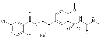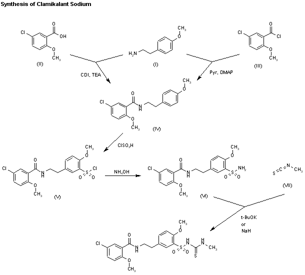 Condensation of 2-(4-methoxyphenyl)ethylamine (I) with either 5-chloro-2-methoxybenzoic acid (II) by means of CDI and TEA or 5-chloro-2-methoxybenzoyl chloride (III) by means of pyridine and DMAP gives the corresponding benzamide (IV), which by treatment with chlorosulfonic acid yields the sulfonyl chloride (V). Reaction of compound (V) with aqueous ammonia in acetone affords the expected sulfonamide (VI), which is finally treated with methyl isothiocyanate (VII) by means of either KOtBu or NaH in DMF.