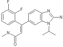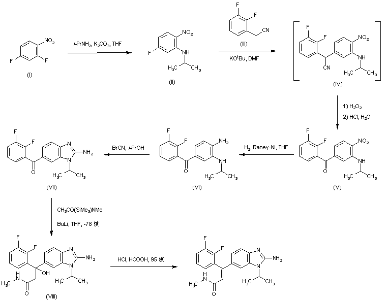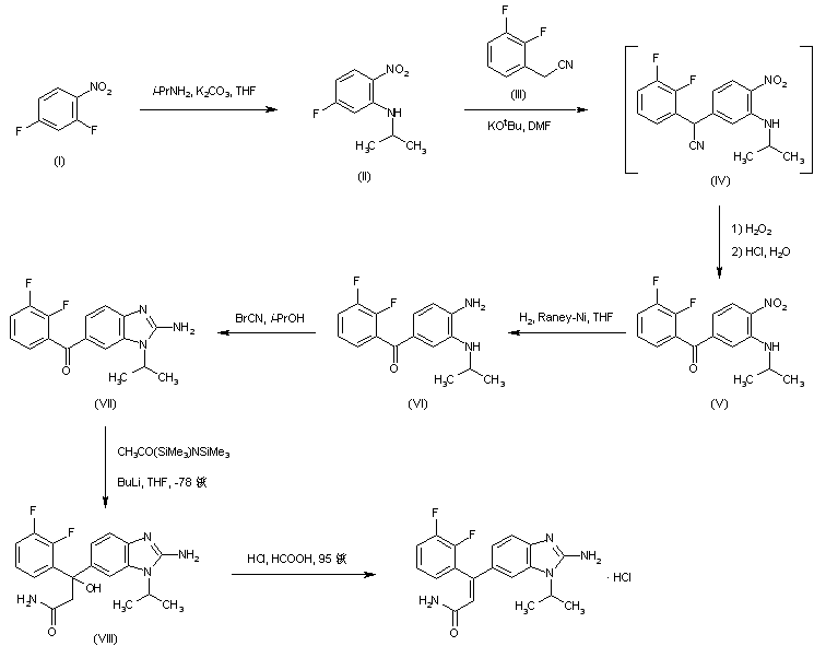 Treatment of 2,4-difluoronitrobenzene (I) with isopropylamine in the presence of K2CO3 in THF afforded 2-isopropylamino-4-fluoronitrobenzene (II). Subsequent condensation of (II) with 2,3-difluorophenylacetonitrile (III) by means of potassium tert-butoxide, followed by oxidative treatment of the intermediate nitrile (IV) with H2O2 generated benzophenone (V). The nitro group of (V) was then reduced by hydrogenation over Raney Nickel yielding diamine (VI), which was cyclized to benzimidazole (VII) upon treatment with cyanogen bromide. Addition of the lithium anion of bis(trimethylsilyl)acetamide to (VII) gave beta-hydroxyamide (VIII). Finally, acid promoted dehydration of (VIII) furnished the corresponding alpha,beta-unsaturated amide, which was isoalted as the hydrochloride salt.