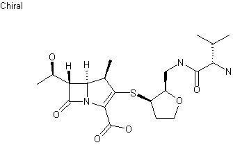 Coupling of carbapenem phosphate (VIII) with thiol (XIII) using diisopropylethylamine gave rise to sulfide (XIX). Hydrogenolysis of the p-nitrobenzyl group of (XIX) with simultaneous azide reduction in the presence of Pd/C provided (XX). Treatment of p-nitrobenzyl chloroformate (XXI) with p-nitrophenol (XXII) afforded the nitrophenyl carbonate (XXIII), which was coupled with L-valine (XXIV), yielding carbamate (XXV). Activation of (XXV) with N-hydroxy succinimide and DCC then produced the succinimidyl ester (XXVI). Amine (XX) was coupled with succinimidyl ester (XXVI) to furnish amide (XXVII). The p-nitrobenzyl ester was finally removed by hydrogenation over Pd/C to provide the title compound.
