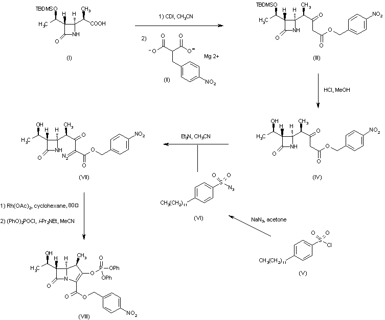 Azetidineacetic acid derivative (I) was activated with 1,1'-carbonyldiimidazole and then condensed with p-nitrobenzyl malonate magnesium salt (II) to afford ketoester (III). Desilylation of (III) with methanolic HCl then gave alcohol (IV). Dodecylbenzenesulfonyl azide (VI) was prepared by treatment of sulfonyl chloride (V) with NaN3. Reaction of (IV) with sulfonyl azide (VI) provided diazo ester (VII). Ring closure of (VII) in the presence of rhodium diacetate in hot cyclohexane, followed by condensation with diphenylphosphoric chloride furnished carbapenem phosphate (VIII).