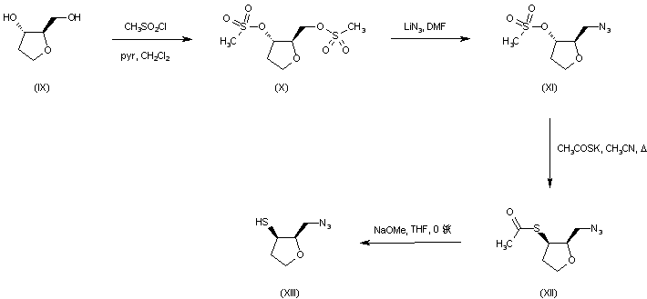 1,2-Dideoxy-D-ribose (IX) was converted to bismesylate (X) upon treatment with methanesulfonyl chloride and pyridine. Displacement of the primary mesylate group of (X) with LiN3 in DMF gave azide (XI). The secondary mesylate group was further displaced with potassium thioacetate to provide (XII). Thiol (XIII) was then prepared by hydrolysis of the thioester function with NaOMe in THF.