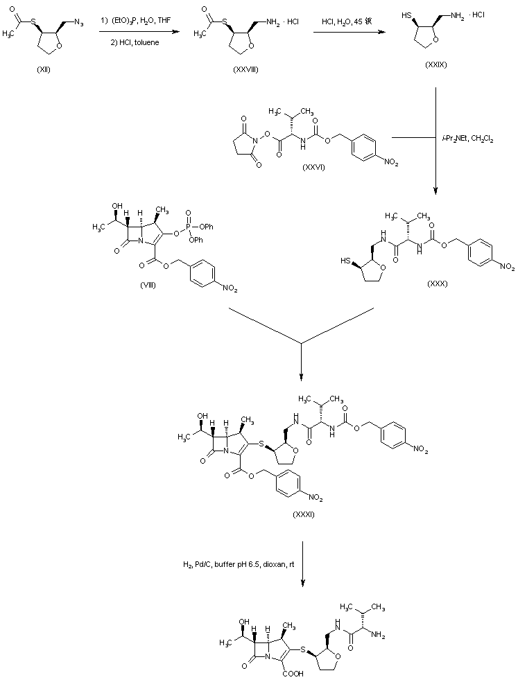 A convergent synthesis was further developed. Azide (XII) was reduced to the corresponding amine (XXVIII) employing triethyl phosphite. Hydrolysis of the thioacetate ester of (XXVIII) then gave thiol (XXIX). Coupling of (XXIX) with protected valine succinimidyl ester (XXVI) produced amide (XXX). Condensation of (XXX) with carbapenem phosphate (VIII) yielded adduct (XXXI). The p-nitrobenzyl esters were finally deprotected by catalytic hydrogenation.
