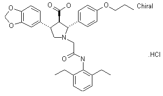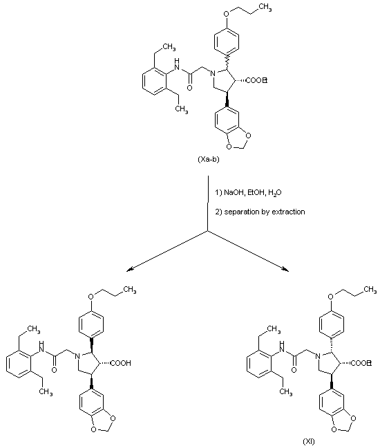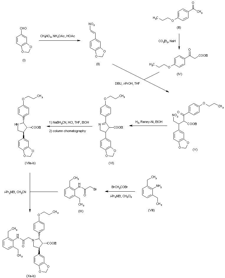 Condensation of piperonal (I) with nitromethane in the presence of ammonium acetate in AcOH provided nitrostyrene (II). Ketoester (IV) was prepared by carbethoxylation of 4'-propoxyacetophenone (III) with diethyl carbonate. Subsequent conjugate addition of ketoester (IV) to nitrostyrene (II) using DBU provided adduct (V). Hydrogenation of the nitro group of (V) over Raney Nickel, with concomitant ring closure formed the cyclic imine (VI), and further reduction of (VI) with NaBH3CN yielded the corresponding pyrrolidine as a diastereomeric mixture. Chromatographic separation removed the cis,cis isomer, affording a mixture of trans,trans and cis,trans pyrrolidines (VIIa, VIIb). 2,6-Diethylbromoacetanilide (IX) was prepared by acylation of 2,6-diethylaniline (VIII) with bromoacetyl bromide. N-Alkylation of the mixture of pyrrolidines (VIIa, VIIb) with bromoacetanilide (IX) furnished (Xa, Xb).