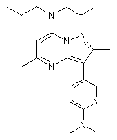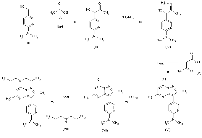 The condensation of 2-[6-(dimethylamino)pyridin-3-yl]acetonitrile (I) with ethyl acetate (II) by means of NaH in THF gives 2-[6-(dimethylamino)pyridin-3-yl]-3-oxobutyronitrile (III), which is treated with hydrazine in refluxing ethanol/water to yield the corresponding hydrazone (IV). The cyclization of (IV) with ethyl acetoacetate (V) in refluxing dioxane affords 3-[6-(dimethylamino)pyridin-3-yl]-2,5-dimethylpyrazolo[2,3-a]pyrimidin-7-ol (VI), which is treated with refluxing POCl3 to provide the expected 7-chloro derivative (VII). Finally, this compound is treated with dipropylamine (VIII) in refluxing acetonitrile to furnish the target dipropylamino derivative.