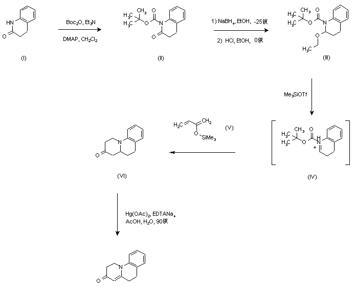 Dihydroquinolinone (I) was protected as the tert-butyl carbamate (II) by condensation with di-tert-butyl dicarbonate. Reduction of (II) with NaBH4 in EtOH at -25 C, followed by reaction with ethanolic HCl provided ethoxy compound (III). Subsequent treatment of (III) with 2-silyloxy-1,3-butadiene (V) and trimethylsilyl triflate afforded benzoquinolizinone (VI), through the sequence of Mannich condensation of intermediate N-tert-Boc iminium salt (IV) with silyl enol ether (V), followed by Michael cyclization of the unsaturated ketone. Then, oxidation with mercuric acetate provided the target 4-4a unsaturated compound together with a minor amount of 1,2-unsaturated product.