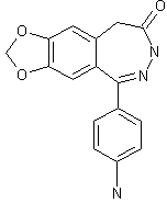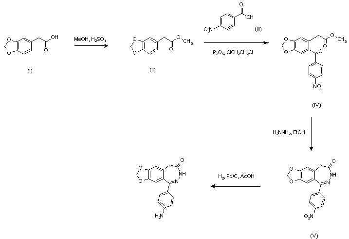 Esterification of 3,4-(methylenedioxy)phenylacetic acid (I) with methanol in the presence of sulfuric acid provided methyl ester (II). Fiedel Crafts acylation of (II) with 4-nitrobenzoic acid (III) under the action of P2O5 in refluxing dichloroethane yielded ketone (IV). This compound was refluxed with hydrazine hydrate in ethanol to afford benzodiazepinone (V). Finally, the nitro group was reduced by hydrogenation in acetic acid with Pd/C as the catalyst or with Raney-Ni and hydrazine to give the corresponding amine.