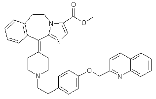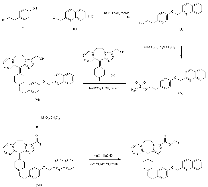 Condensation of 4-hydroxyphenylethanol (I) with 2-(chloromethyl)quinoline (II) in ethanolic KOH provided ether (III). The free hydroxyl group of (III) was then converted to the corresponding mesylate (IV) by treatment with methanesulfonyl chloride and Et3N. Alkylation of 11-(4-piperidinylidene)-6,11-dihydro-5H-imidazo[2,1-b][3]benzazepine-3-methanol (V) with mesylate (IV) in the presence of NaHCO3 gave adduct (VI). The primary alcohol of (VI) was oxidized to aldehyde (VII) using MnO2 in CH2Cl2. Finally, aldehyde (VII) was further oxidized to the title methyl ester by means of MnO2 in the presence of sodium cyanate in HOAc-MeOH.