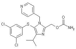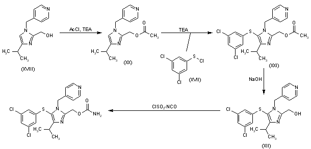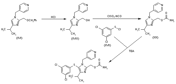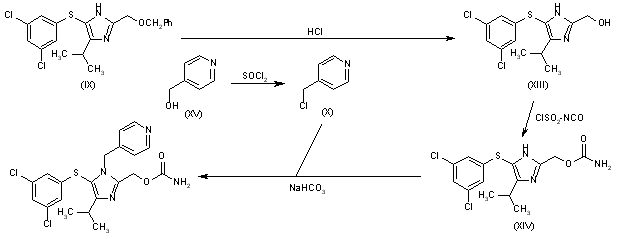 The debenzylation of 2-(benzyloxymethyl)-5-(3,5-dichlorophenylsulfanyl)-4-isopropyl-1H-imidazole (IX) with hot aqueous HCl gives 5-(3,5-dichlorophenylsulfanyl)-4-isopropyl-1H-imidazole-2-methanol (XIII), which is condensed with chlorosulfonyl isocyanate in acetonitrile to yield carbamic acid 5-(3,5-dichlorophenylsulfanyl)-4-isopropyl-1H-imidazol-2-ylmethyl ester (XIV). Finally, this compound is alkylated with 4-(chloromethyl)pyridine (X) - obtained by reaction of 4-(hydroxymethyl)pyridine (XV) and SOCl2 in acetonitrile - by means of NaHCO3 in ethyl acetate/water.